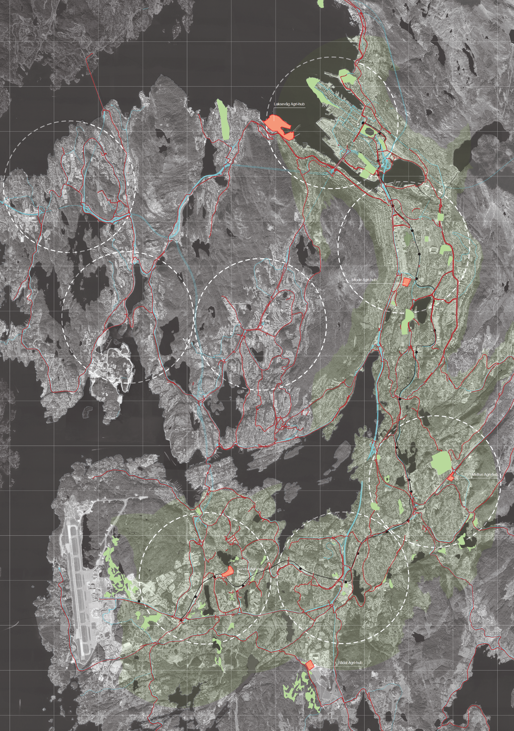 Boring suburbia. Large roads cut through the area and walking / cycling paths follow these motorways. A new network of paths (red) leads through local neighbourhoods and areas of beauty instead. The network connects the agri-hub with agri-sources, and existing residential areas with amenities. New programs are established along the route.