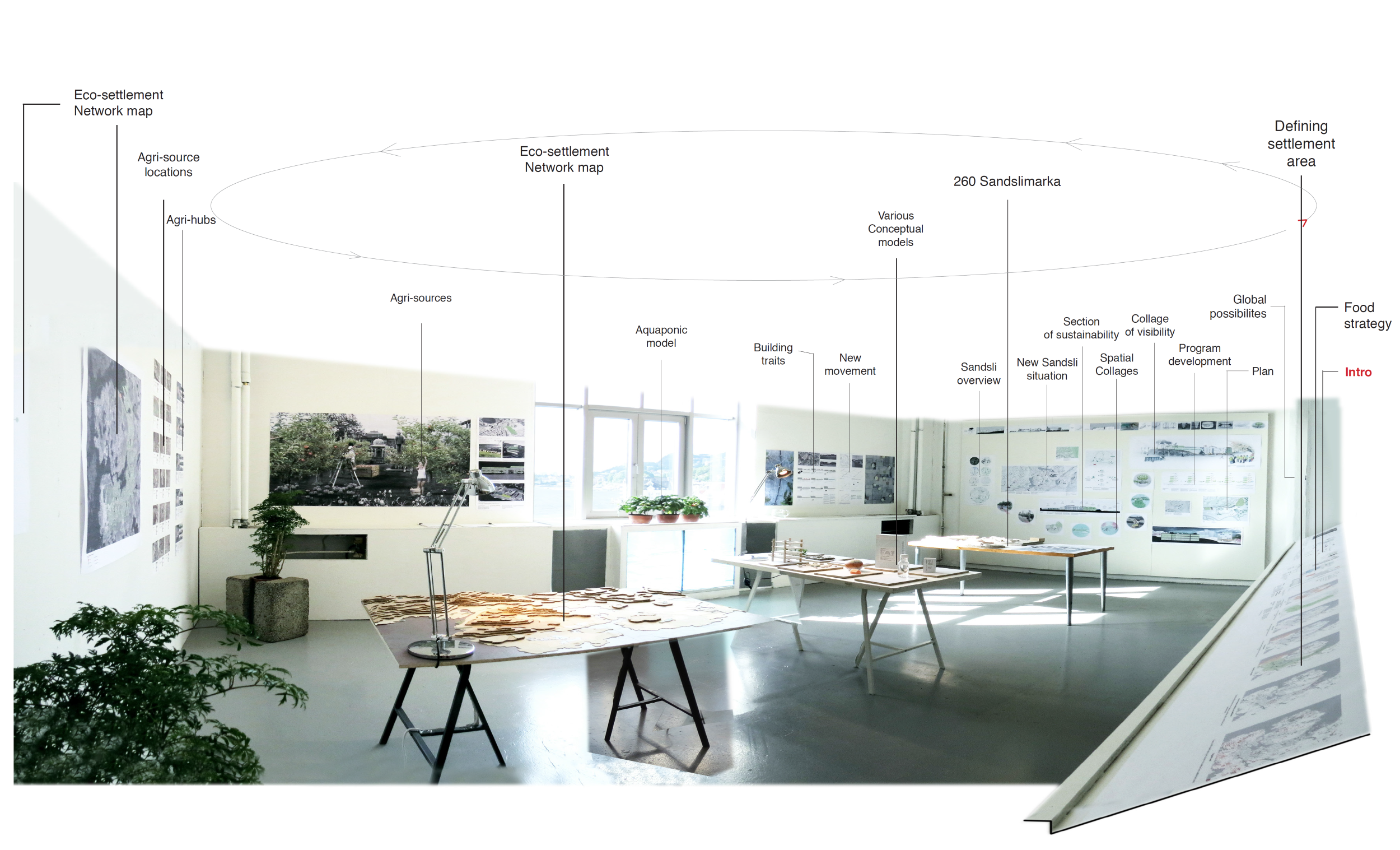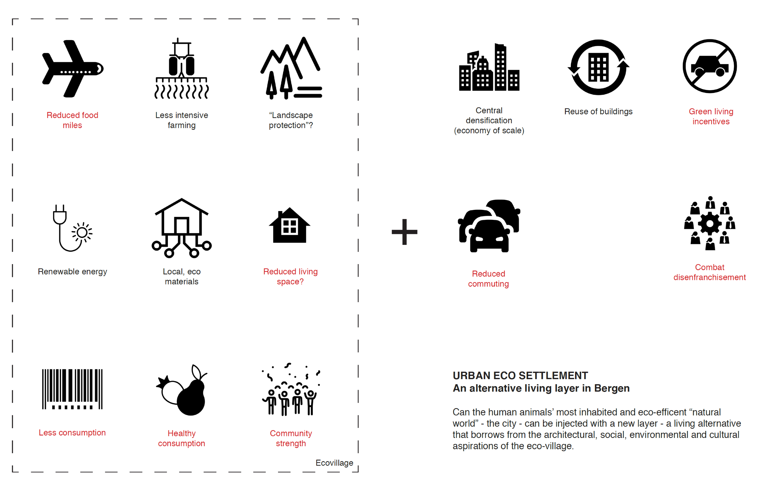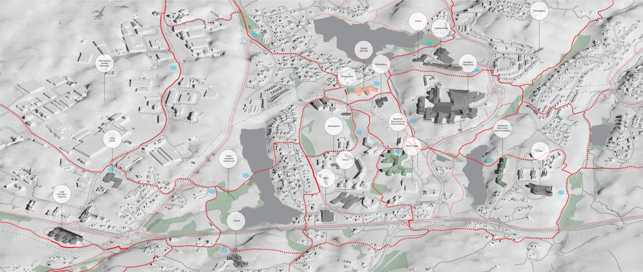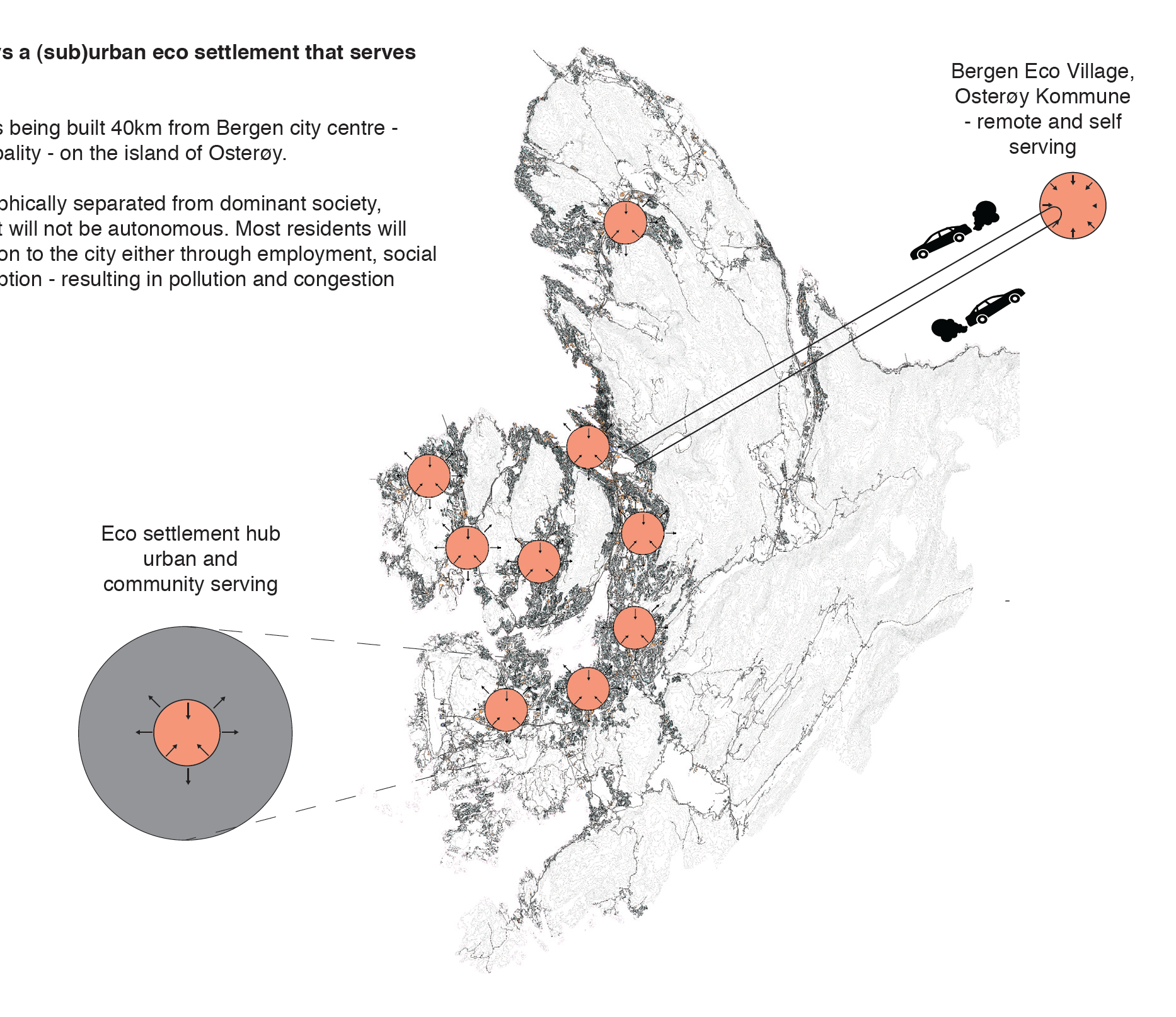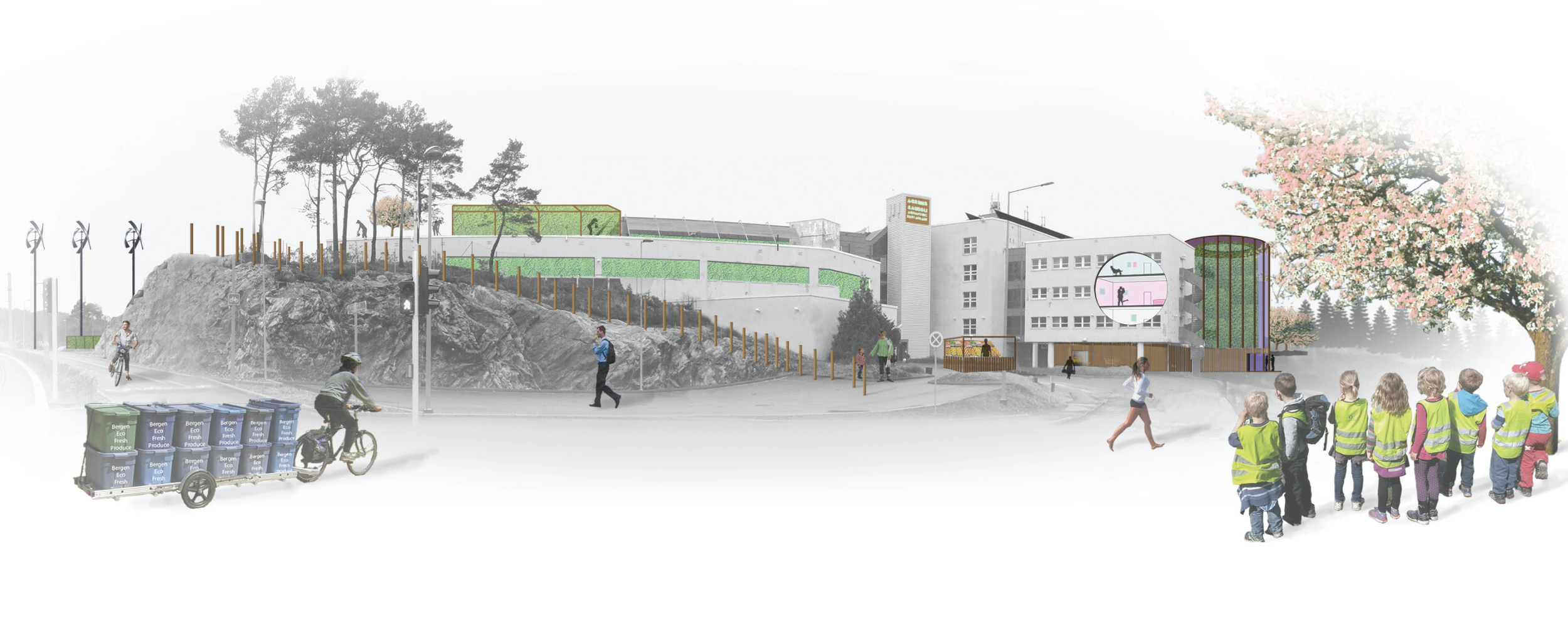 The project includes a case study in Sandsli, a suburban area to the south of Bergen, where the new eco-settlement becomes a community social hub in boring suburbia.