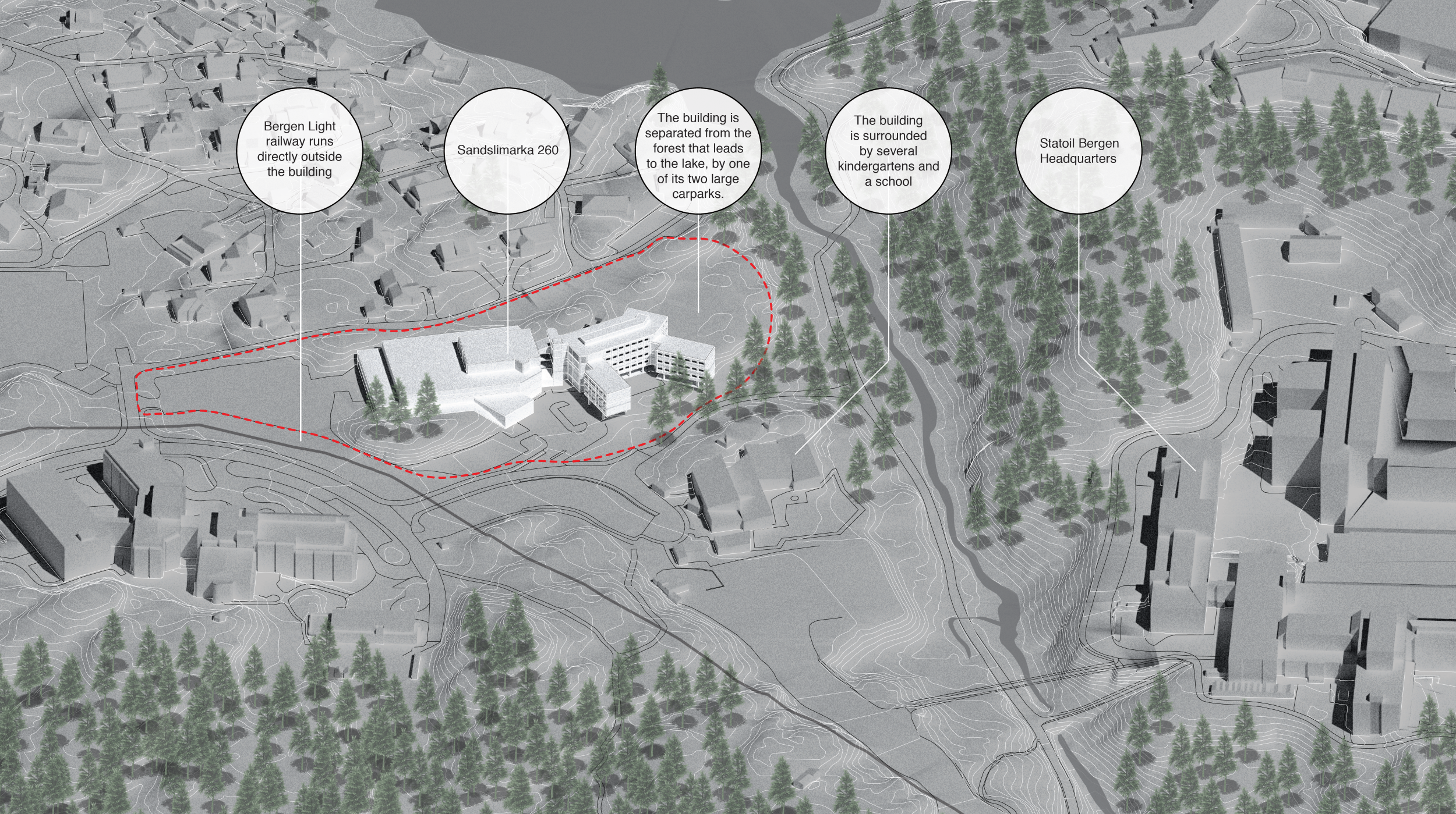 Sandslimarka 260 is a vacant office complex and data centre previously considered for demolition. Bergen’s light railway passes just meters from the building. Asphalt entirely encircles the building.
