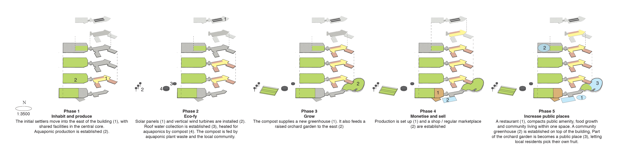 It comprises a new living alternative in Bergen, a network of communities throughout the core of the city that reuses Bergen's many post-industrial / post-oil buildings as a resource. These large-scale buildings become a place to grow local and sustainable foods. The communities live in or around these hubs, growing key aquaponic foods for themselves and the city, and also harvest food from many of Bergen's other resources.