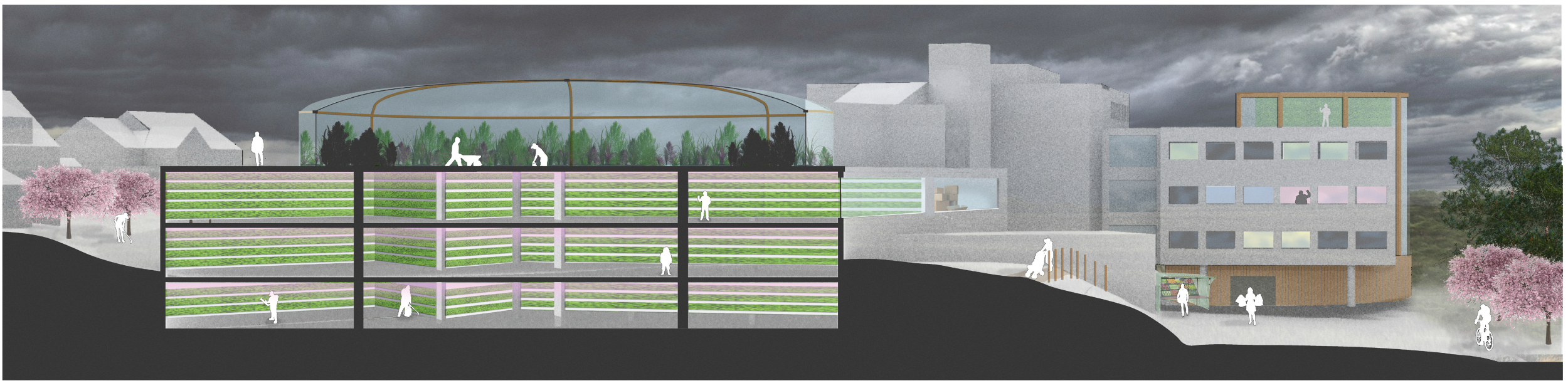 Concept for a restaurant area below food growing terraces