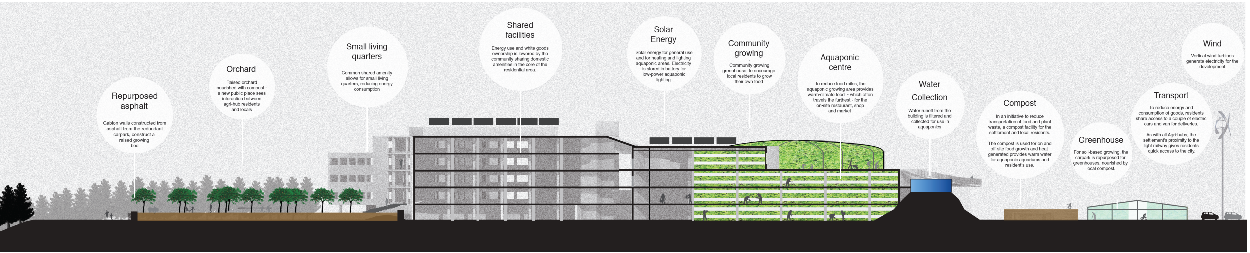 Within this corridor, there are five main Hotspots, and an settlement is established in each of these. Each of the five settlements reuse existing, post-industrial buildings suitable for aquaponic food production.