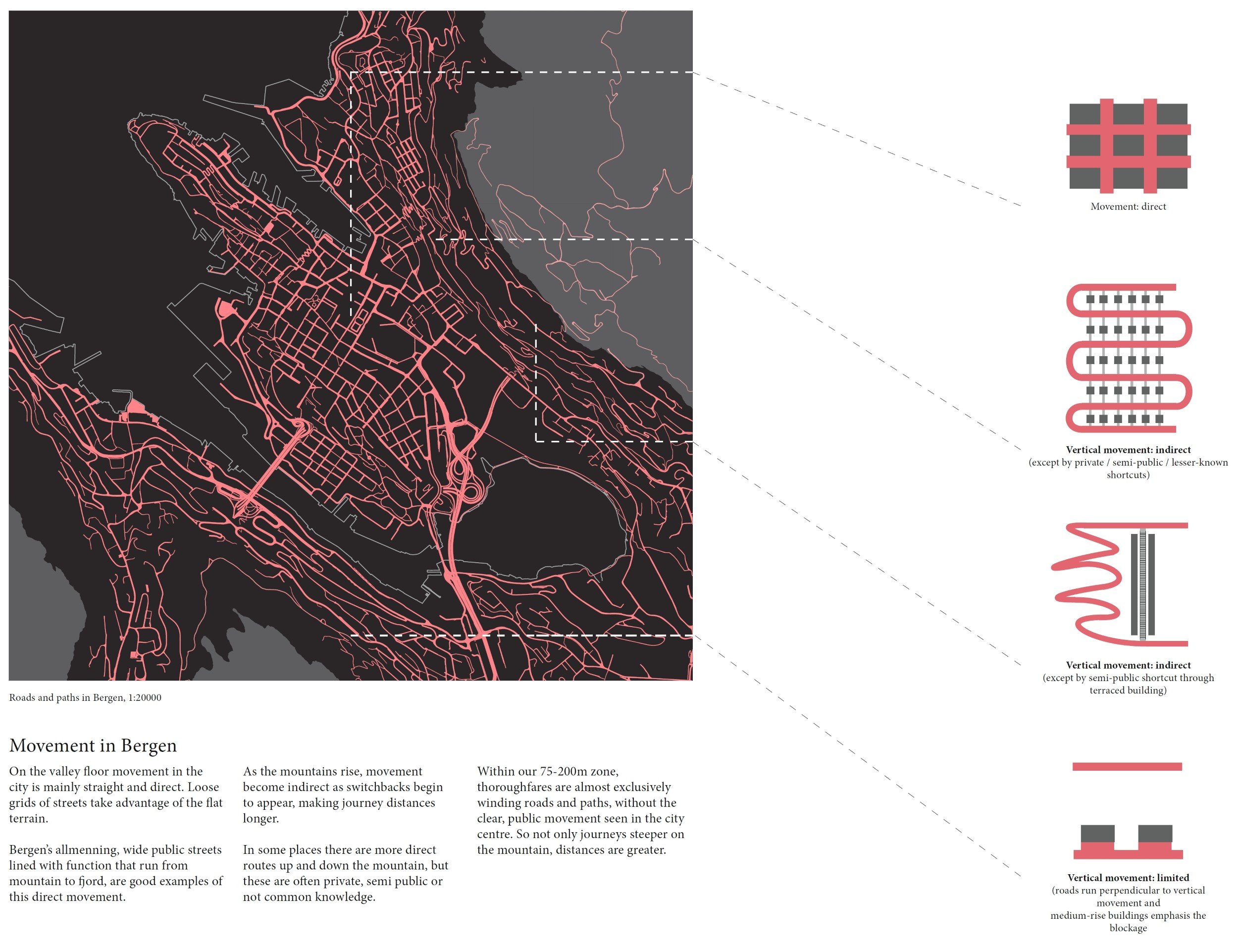 Situated between the fjord and mountain, the city fabric has historically expanded north and south through the valley, with its suburbs stretching many kilometers from the city centre. Today, only 17% of people live in the historic centre Bergenhus.