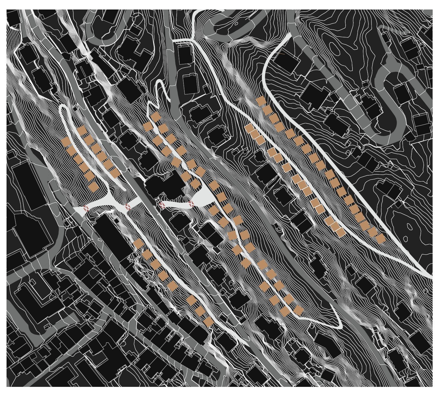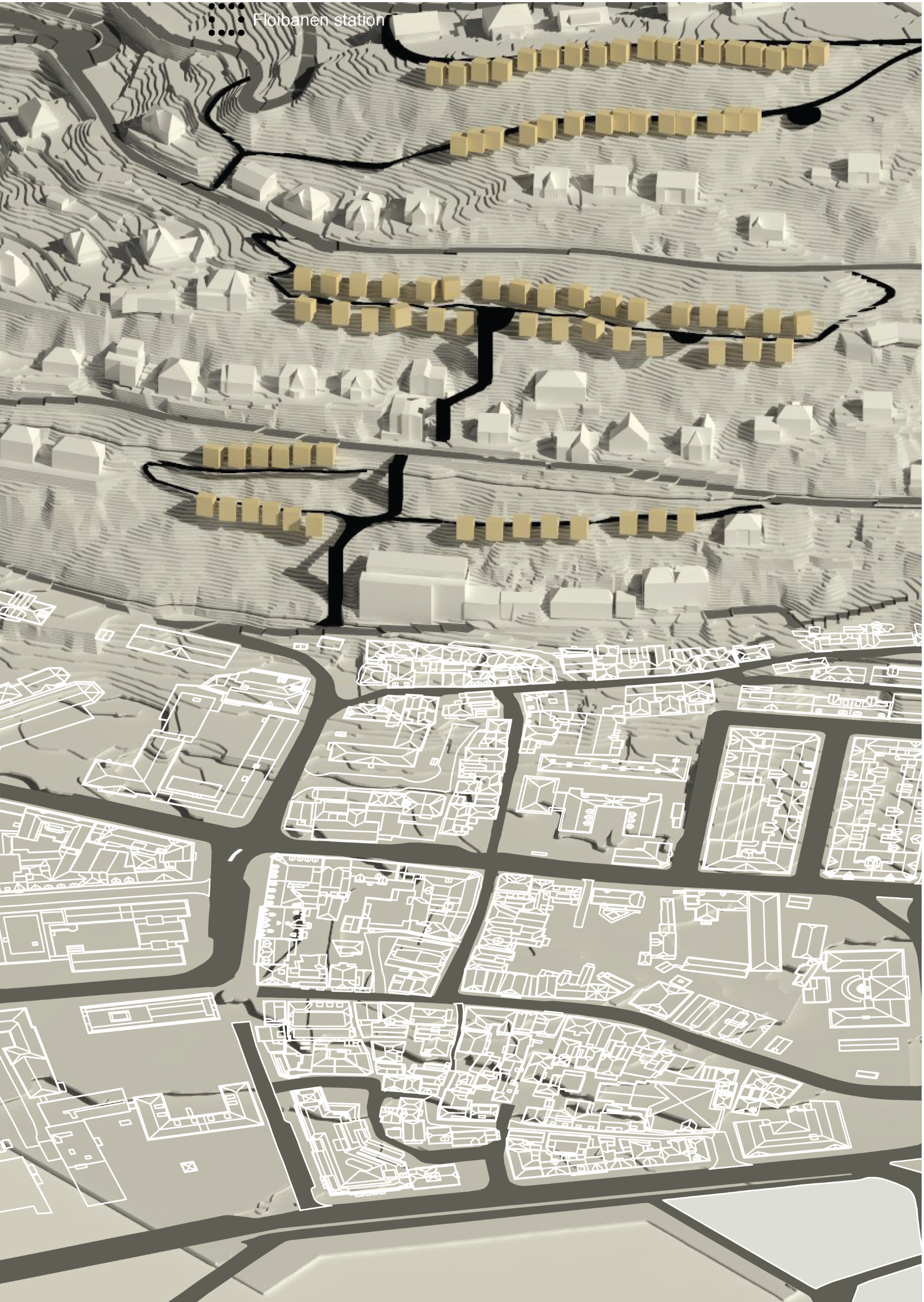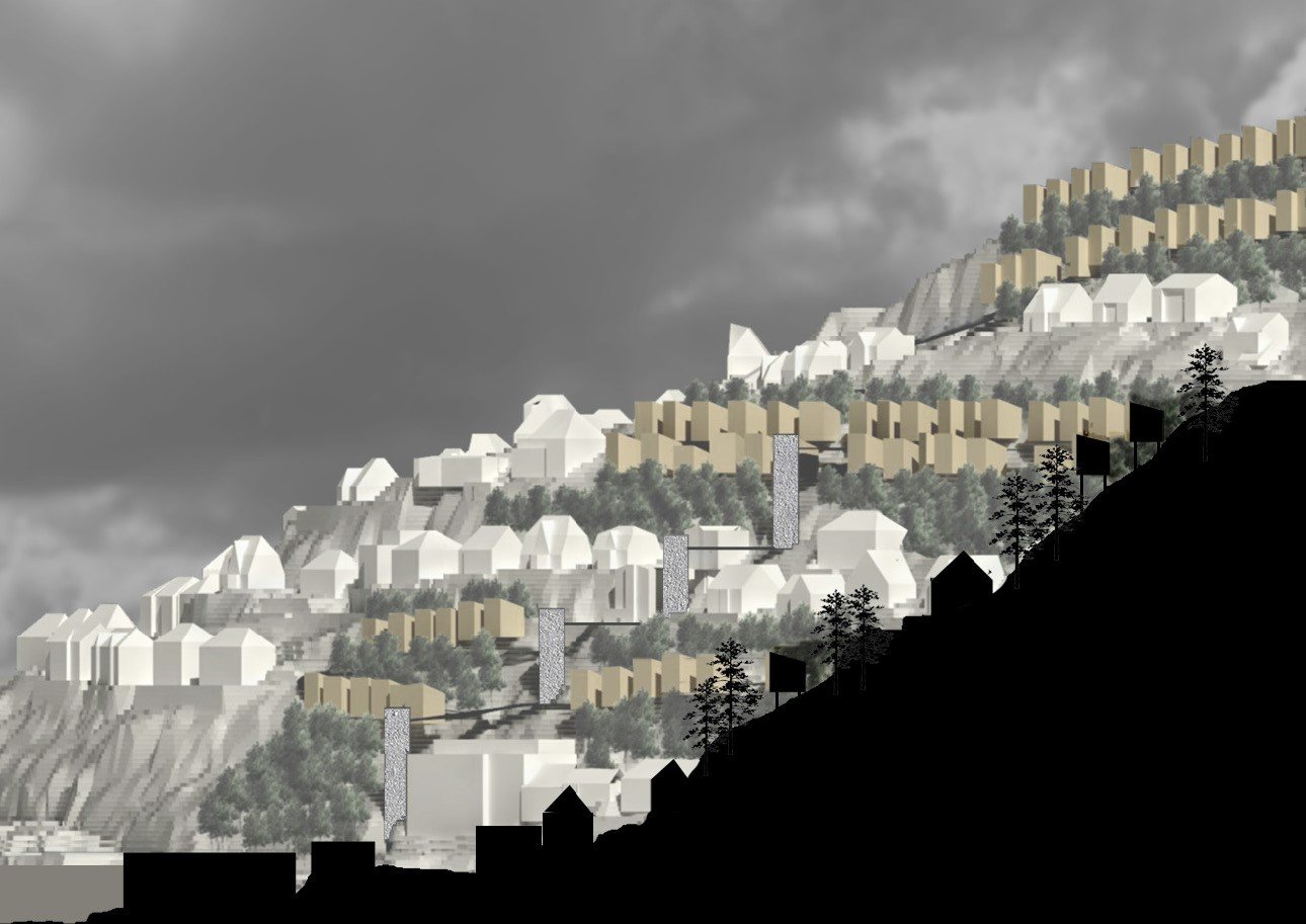 Densifying Fjellsiden with a vertical allmenning (elevators), with stilted, low-level housing units, connected by existing and constructed walkways
